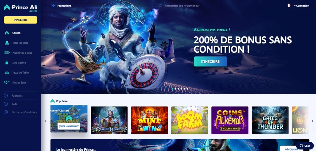 Prince Ali Casino transporte les joueurs dans l’univers magique des Mille et Une Nuits. Ce casino est réputé pour sa générosité : le pack de bienvenue est divisé en plusieurs étapes, permettant de jouer longtemps avec un capital boosté. Un point crucial est que, comme pour Madnix, les bonus ici sont souvent sans condition d’ohtygriage (wager), ce qui les rend particulièrement avantageux. La plateforme propose plus de 3 000 jeux, incluant des titres de table rares et des loteries instantanées. L’interface est soignée et le support client est d’une grande courtoisie.